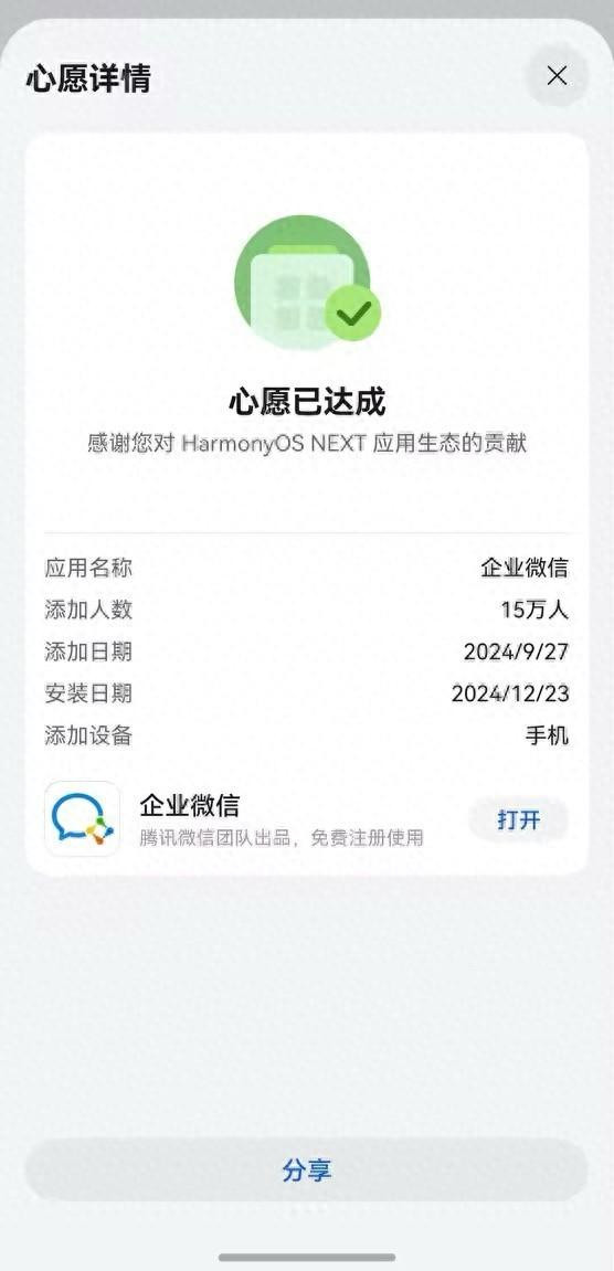 没多久我就收到了来自鸿蒙应用市场的通知——鸿蒙版企业微信上架了!这速度,简直像开了挂一样,简直是妥妥的“许愿神器”!